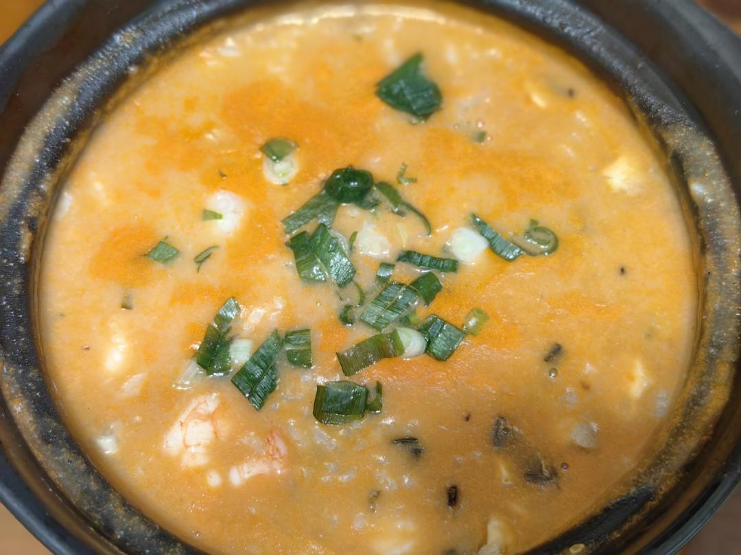 AMMON君 做过 2024年03月01日 砂锅粥1.虾头煸油,加开水一勺盐熬10min2.加煮好的米饭或者生米,煮到滚,生米大概20min,熟米大概5min3.加一勺花生酱4.最后加入海鲜撒葱花出锅 2024-03-01