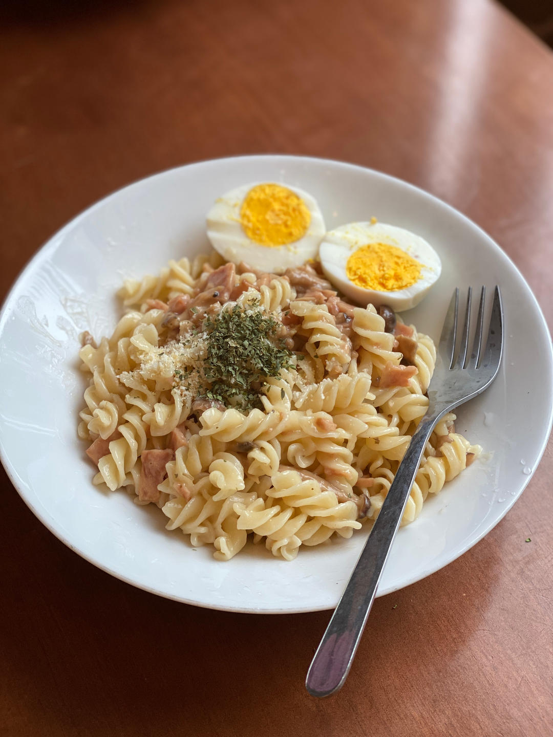 应该算早午餐了,一盒空刻的奶油汁培根螺丝粉,过期了!煮后也没什么不妥的,照样吃掉,加了一只水煮鸡蛋。