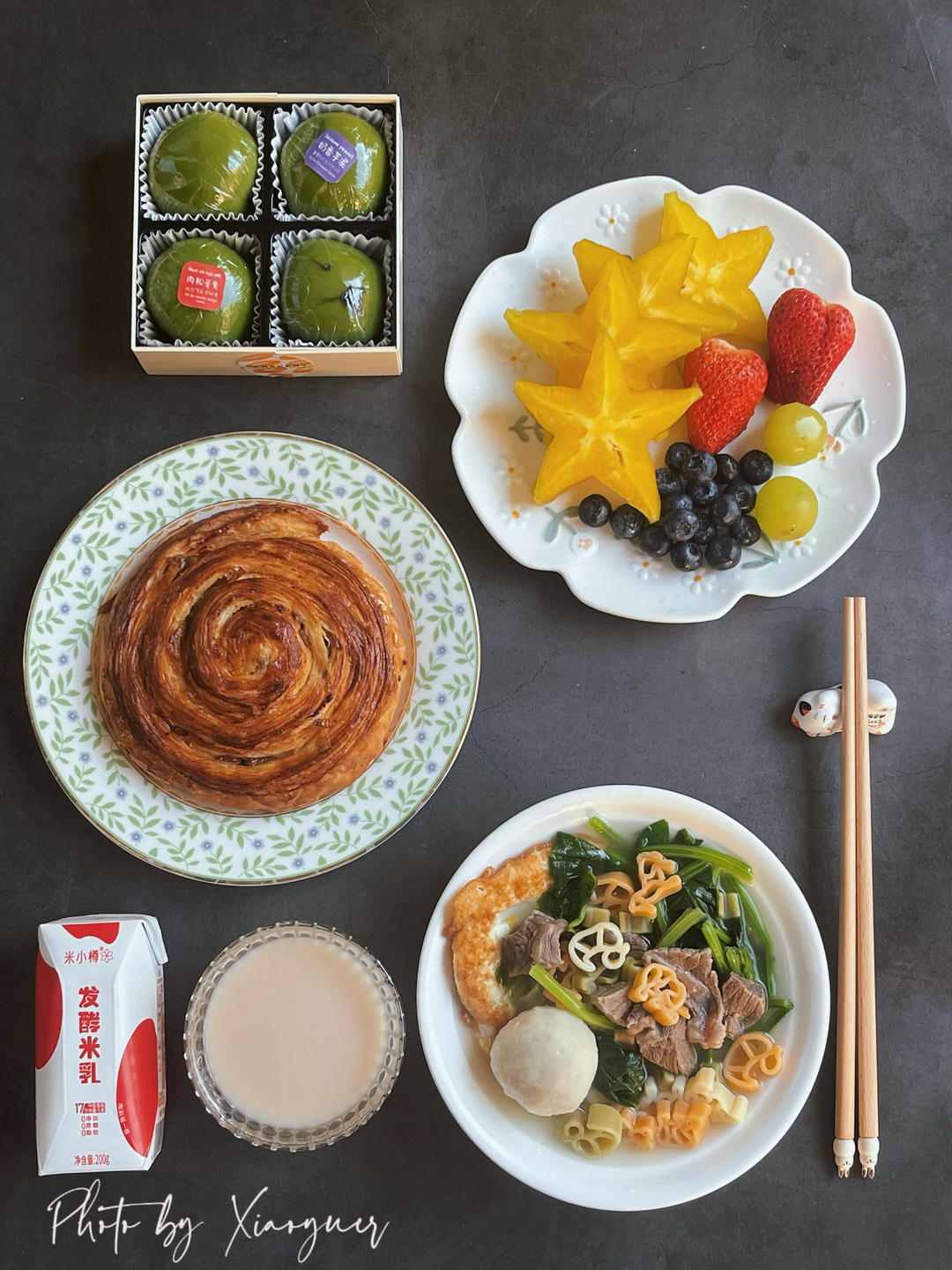 周二早餐:牛肉鱼丸卡通意面、葡萄干卷&青团、水果盘、米乳。趁年华未老,书写辉煌。早安[玫瑰]