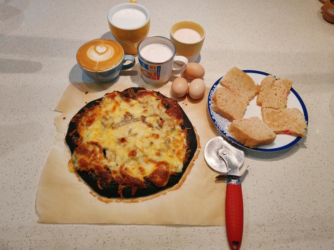 亨师傅早餐1232:竹炭牛肉披萨&发糕&白蛋&牛奶奶咖
