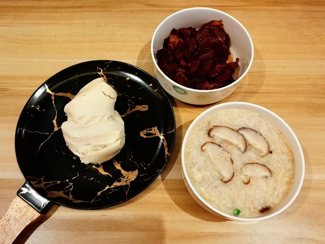 干贝香菇两米粥,川味麻辣香肠, 馒头!