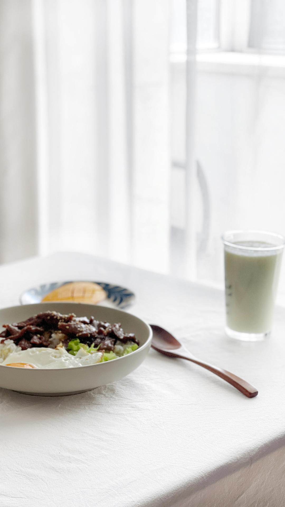 【周三早餐】牛肉生菜拌饭、溏心蛋、牛油果香蕉奶昔,最近看不少人在做,改良了下酱料,非常好吃