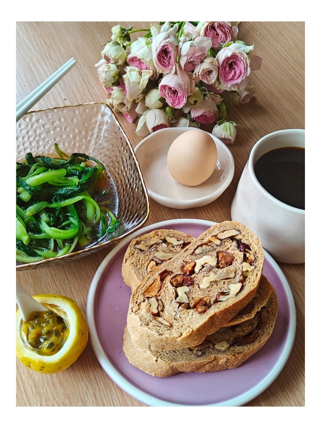 自制的坚果欧包,煮一杯咖啡,烫一份鸡毛菜,再加一枚鸡蛋和百香果,节日快乐呀!
