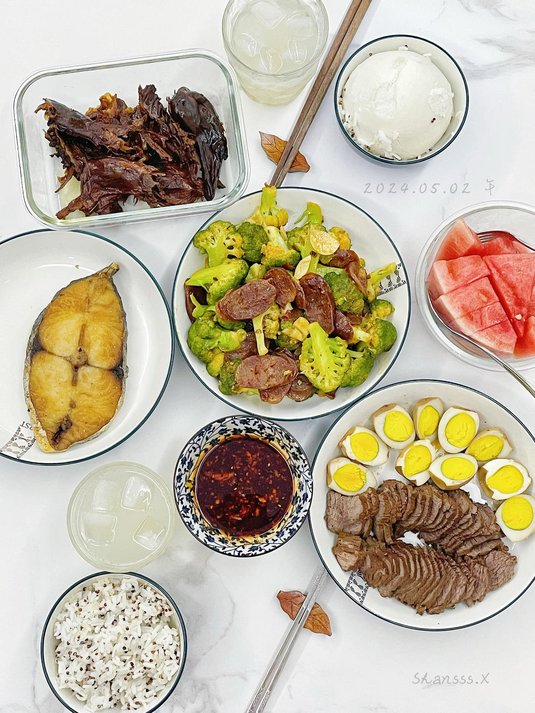 Bingbia-X 做过 午餐•2024年5月2日 #午餐•2024年5月2日# 神仙卤料的卤牛肉 卤鸡蛋!!!😋香肠西兰花马鲛鱼 酱板鸭西瓜 橄榄油柑气泡水#Homemade menu# 2024-05-02