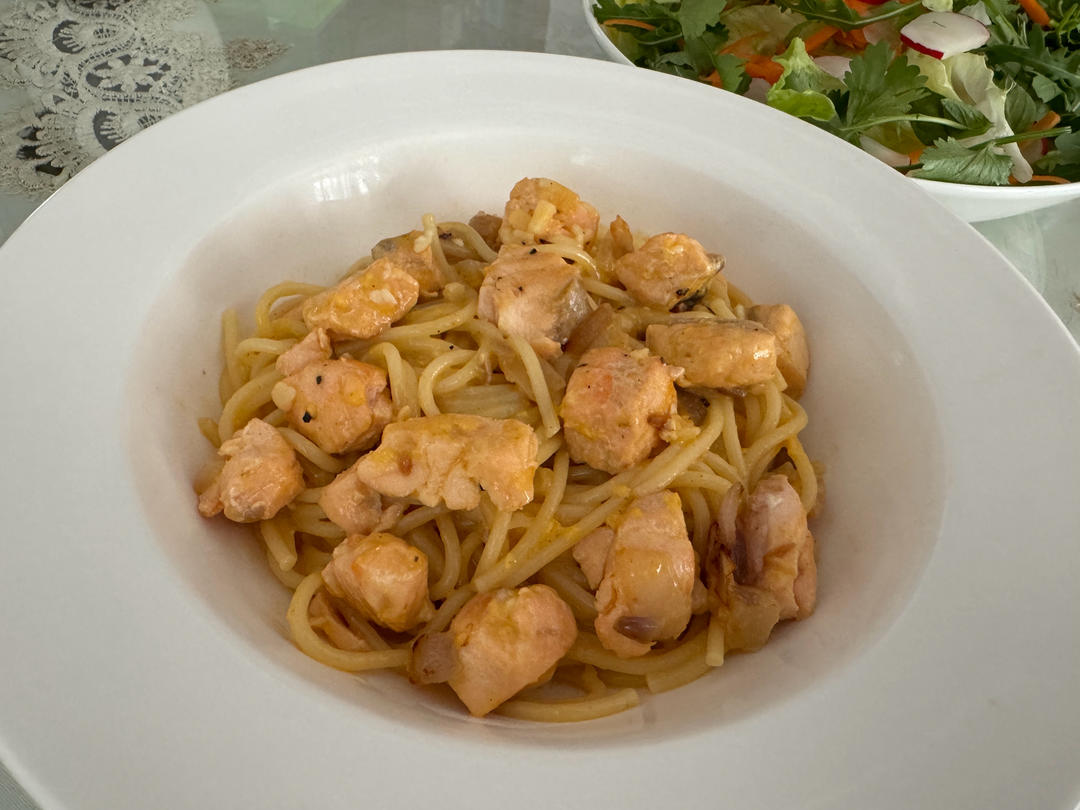 koala007 做过 正宗的Carbonara才不放奶油呢 | 蛋黄酱三文鱼意面 三文鱼非常嫩,加了芝士的蛋黄酱做的意面比加奶油做的减轻了油腻感但是却不乏浓郁感。记录: 两人份:三文鱼 260克 意面 180克 蛋黄酱按照博主方子和量(会稍多点) 2024-05-07