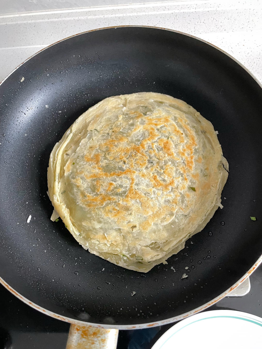 用买的印度飞饼做的,韭菜馅鸡蛋馅夹在中间,味道很不错。