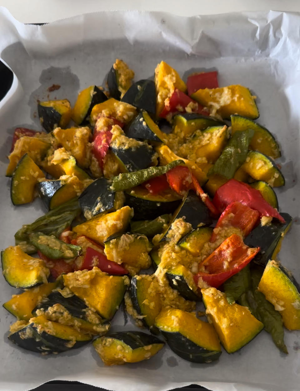 贝贝南瓜加蒜末胡椒粉食用油再加半勺生粉和面粉,腌5分钟,烤箱180度25分钟
