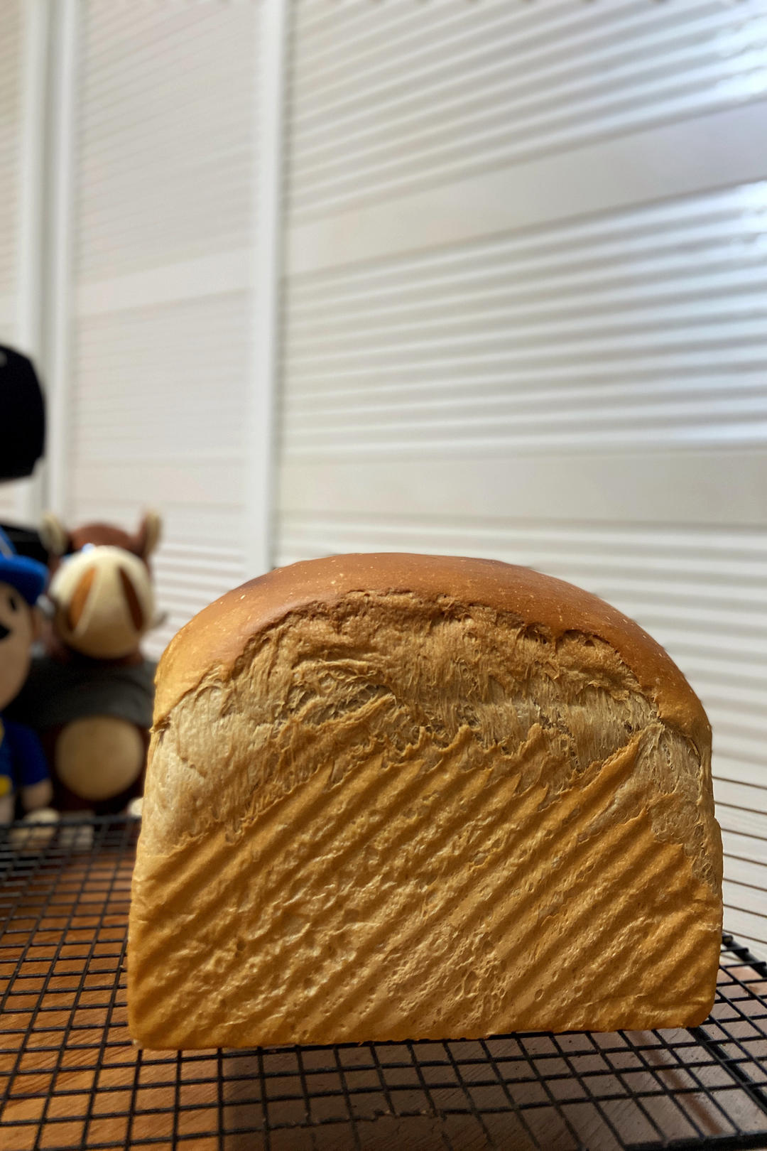 面团状态挺好,有小气泡。下次还是175度烘烤45分钟,因为180度38分钟吐司冷却下来后有点缩腰。特意减糖,尽可能相对摄入少一点的糖量,因为实在太喜欢吃碳水。单从口感方面,减糖后味道确实会打折扣,可以考虑再加5克糖,或者吃其它甜一点的食物时解腻。