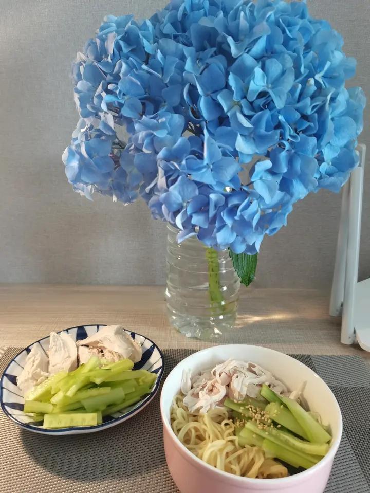安妮咩 做过 2024年06月02日 周六:雪菜目鱼花+拌黄瓜+黑米饭,还有冰荔枝。周日早上:鸡丝凉面拌着葱油酱吃~周日晚上:黄瓜炒饭+简单+冷泡柚香白茶今天的餐桌有漂亮的蓝色绣球花O(≧∇≦)O 2024-06-02