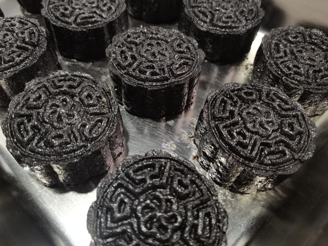 黑芝麻糕:200克芝麻粉+100克糯米粉+木薯粉50+糖60+水110+油45