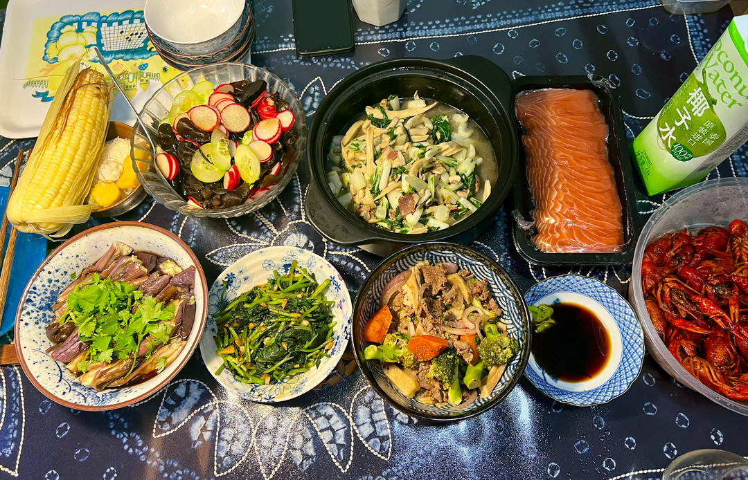 中午爸爸主厨,晚上厨房归我掌管,🤡打下手(切菜&翻炒一下)。中午剩的一碗牛里脊肉+半盆小龙虾+玉米番薯饭,我再拌了个蒸茄子(加酱油醋香菜,灵魂是一点花椒油!)和大拌菜(木耳黄瓜樱桃小萝卜,和茄子同款调味),炒了蕃薯藤和手捏菜炒蘑菇(昨天刚偷师今天就迫不及待尝试了😝放咸肉调味儿是明智的决定!)。还有盒马买的三文鱼刺身(附带芥末酱油),我和我妈各一块就腻了,主要靠俩男的主力了。人均9~10分饱🙈