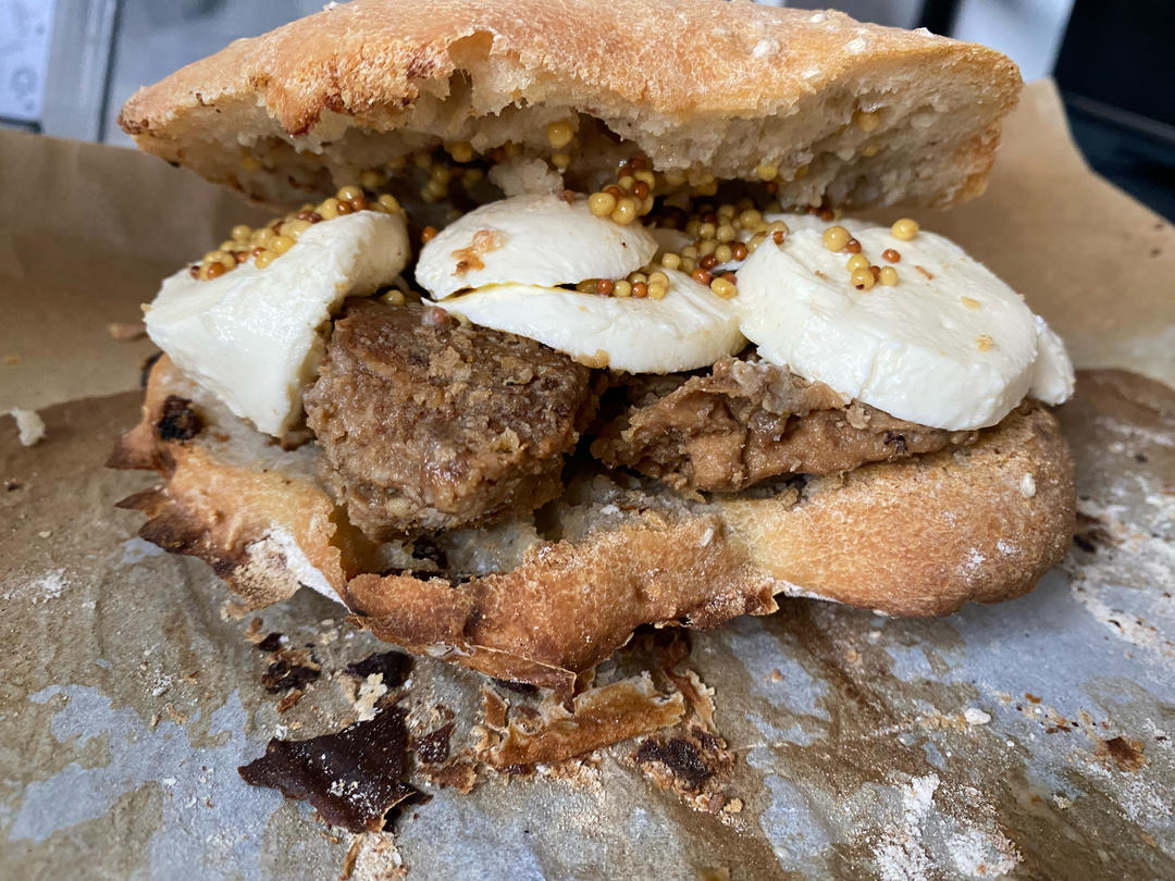 面包放冷 一批二 往里面加了牛肉 酸黄瓜 芥末籽 bocconcini奶酪 绝对好吃 拉丝拉起来