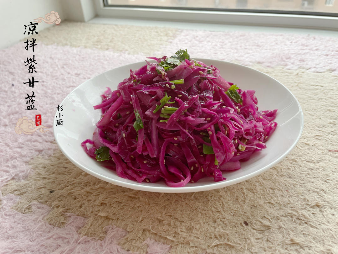 紫甘蓝切丝洗净,用开水烫一下,加入盐、白醋、小磨油拌匀,香菜、白芝麻点缀。