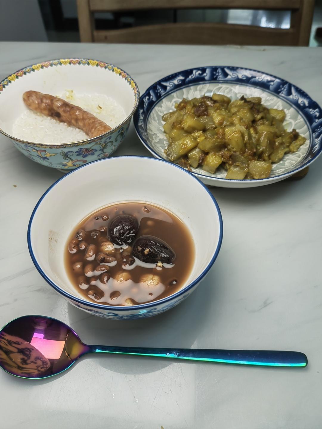 小朋友的午餐,咖喱茄子,糯米肠,大米饭,红豆莲子汤。