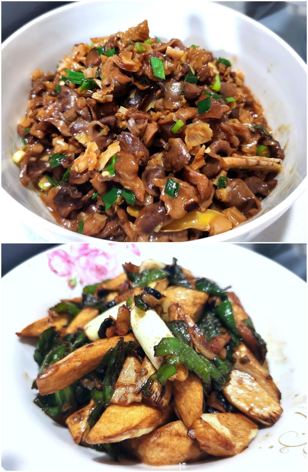 早上搞好的中餐,白辣椒炒鸡胗,擂辣椒炒茭瓜。