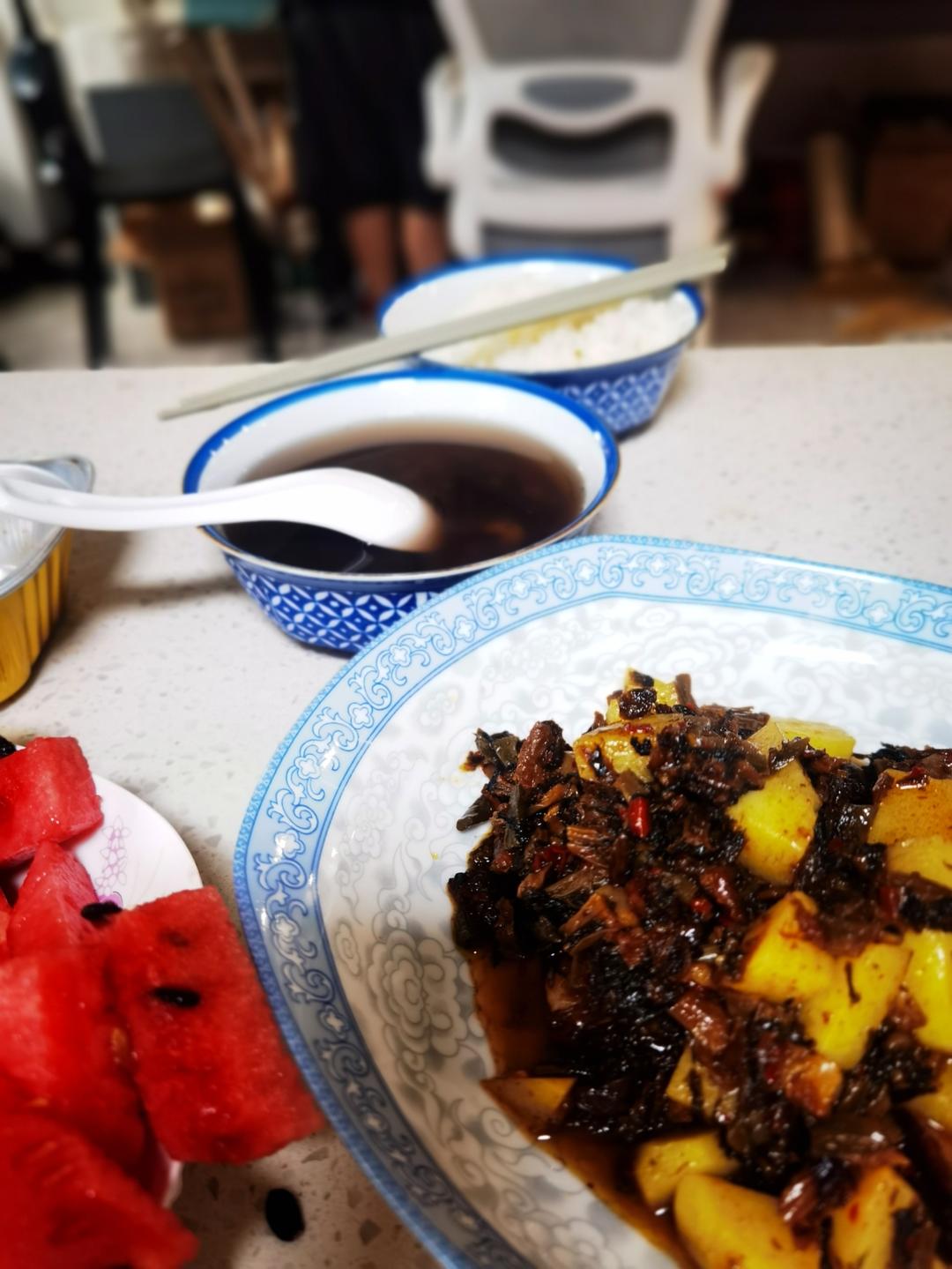 小学生暑期晚餐,绿豆红豆黑豆汤+梅干菜土豆+西瓜,yami 😄