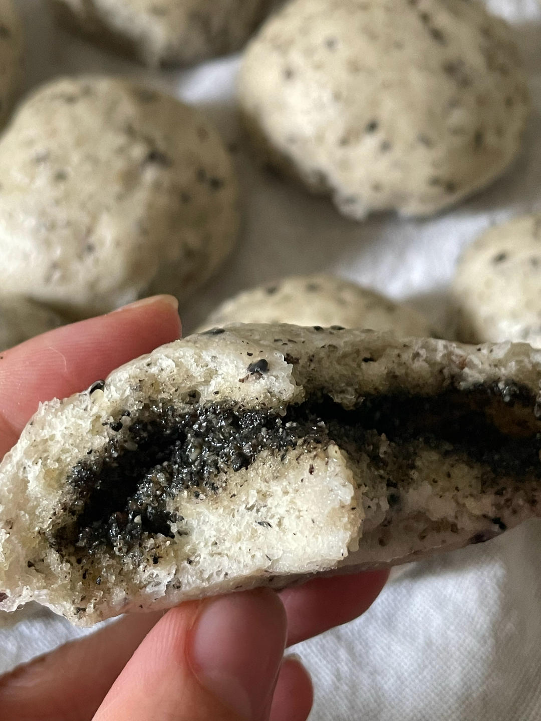皮:低粉178+中粉42,酵母2,泡打粉2,水110,糖20,亚麻籽油5,芝麻粉15。