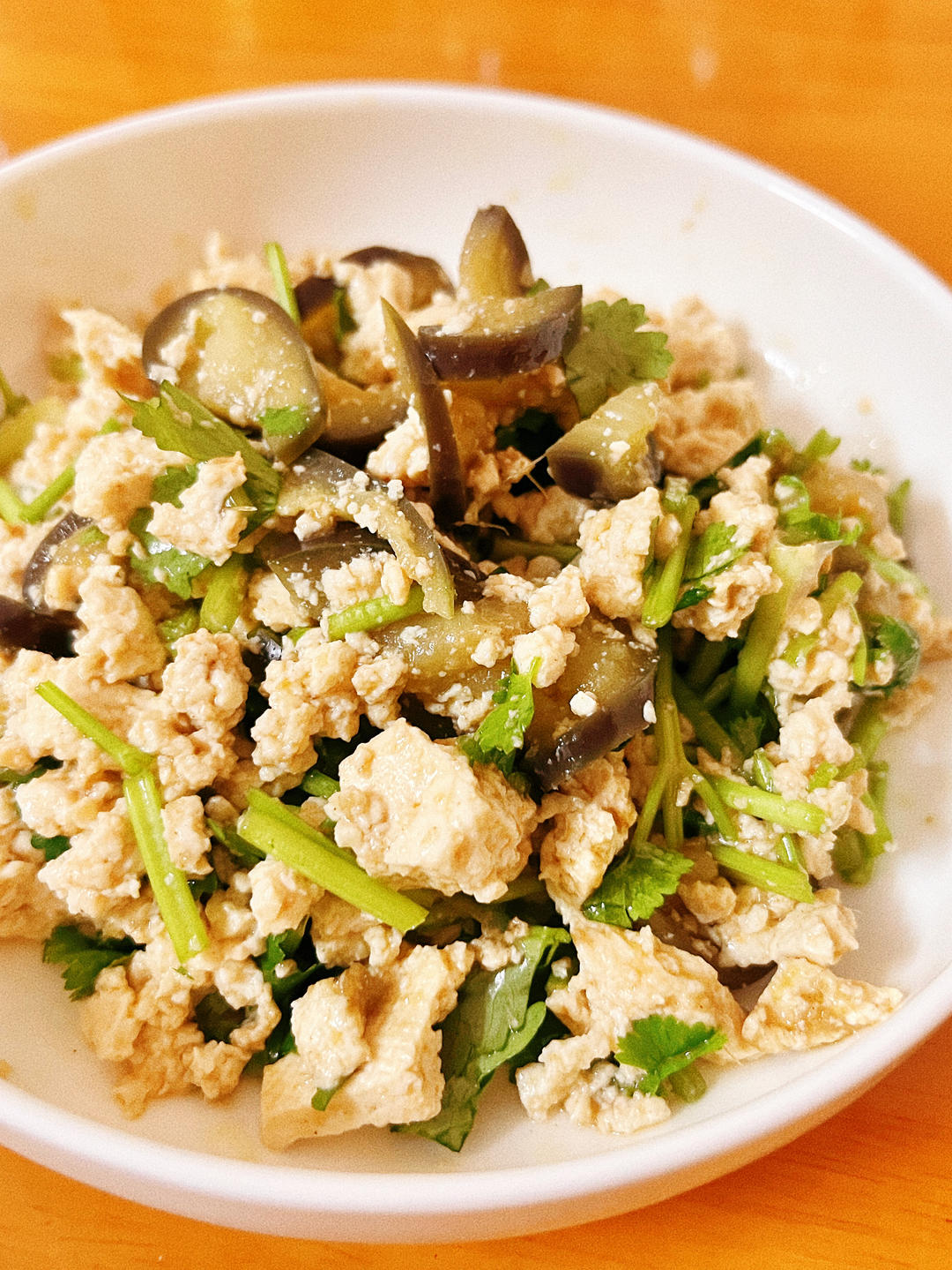 茄子拌豆腐,果然软糯的茄子和木棉豆腐还是挺搭的,香菜放得挺多的,但它只是调味的,可以少量放