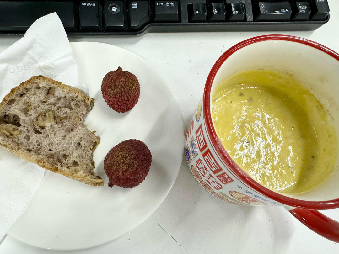 匆忙的又不失营养的早餐:南瓜糊(加了生姜片)、坚果全麦、荔枝