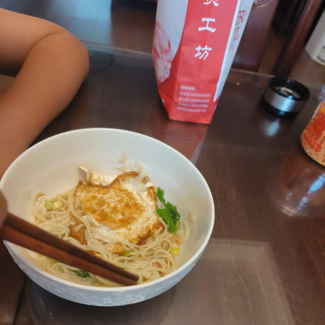 清汤面:油热打个荷包蛋,加开水,下面条下菜煮熟
