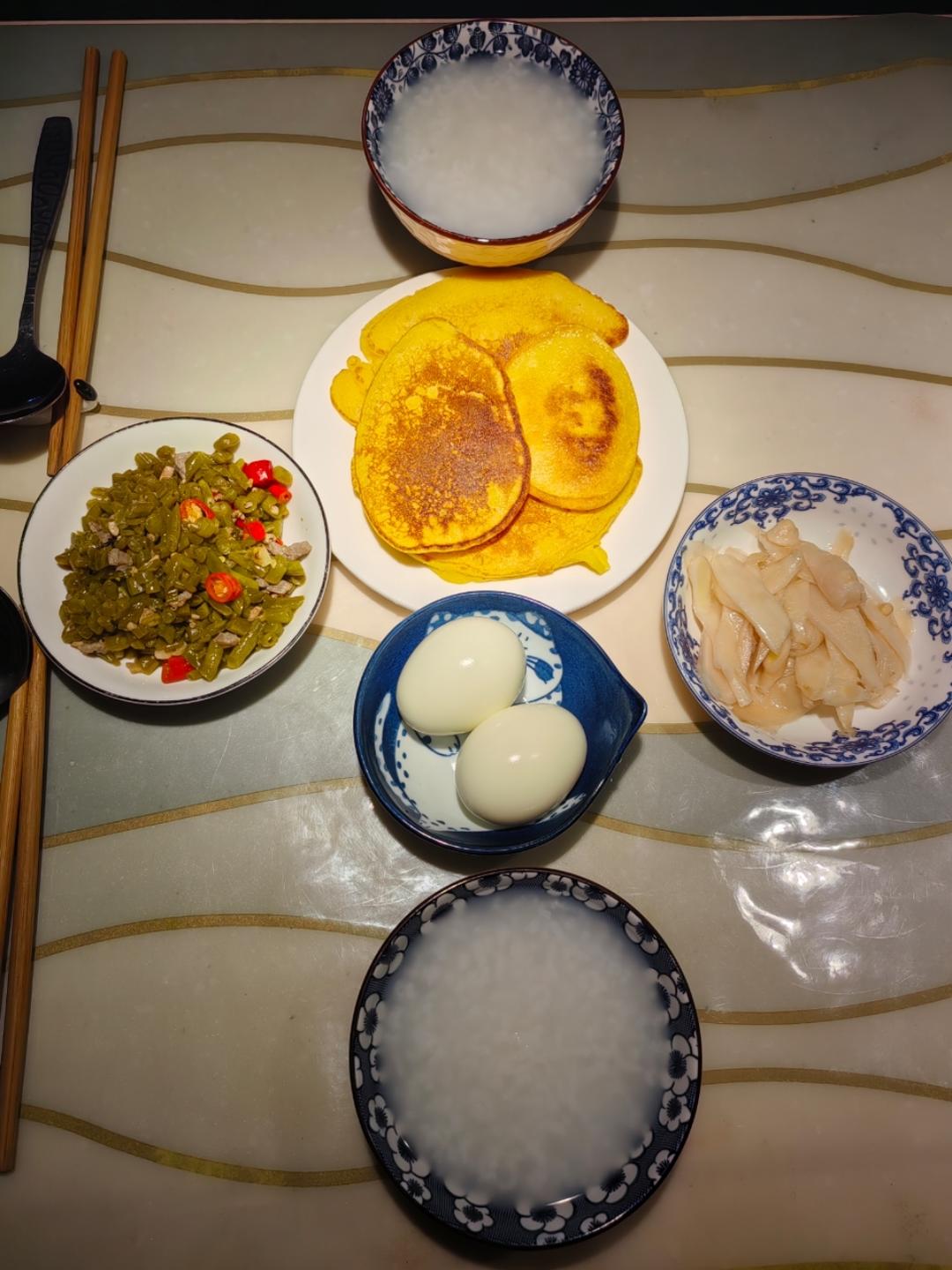 许食贰 做过 2024年08月15日 新买的玉米面加上牛奶鸡蛋,小火煎成小饼,白水鸡蛋,这个季节独有的仔姜,把它用盐码后放上麻油白醋放冰箱,一道开味菜,还是这个季节有的豇豆,泡菜后用肉沫炒,特下饭的一道菜。白粥配上。完美。 2024-08-15