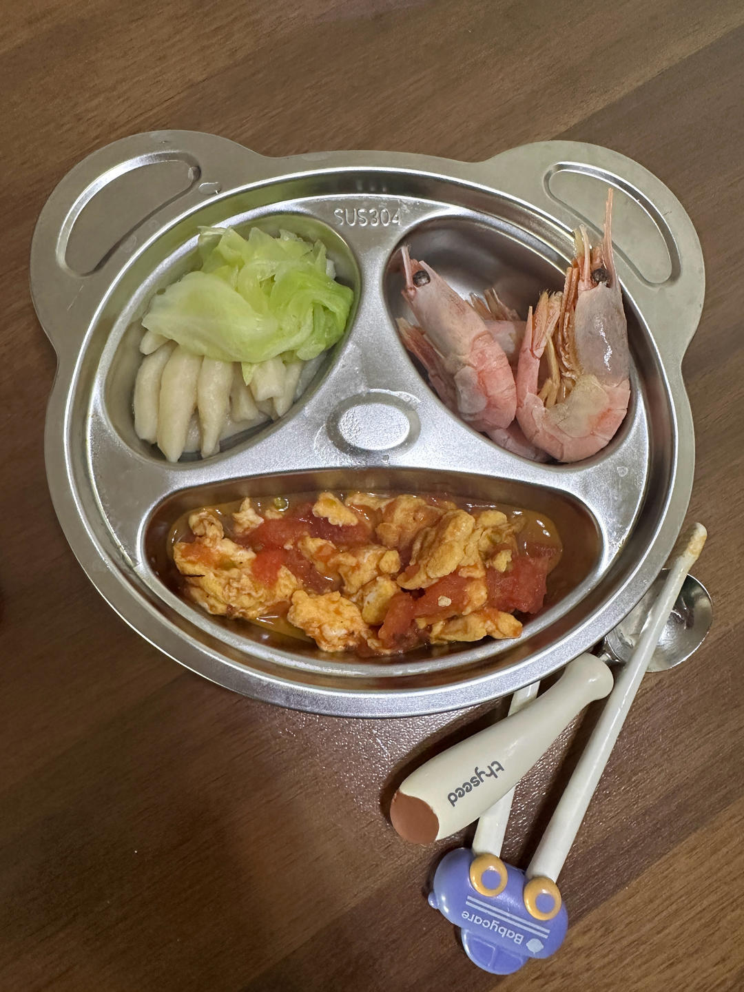番茄炒蛋、卷心菜山药面、北极虾