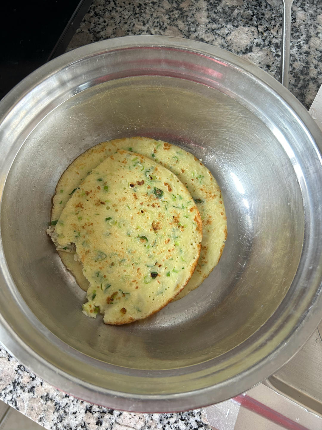 100克面粉加170克左右65度温水,搅拌均匀加入鸡蛋,过筛后加葱和盐,搅拌均匀,锅底喷油倒入面糊,盖上锅盖,一面熟了再翻面