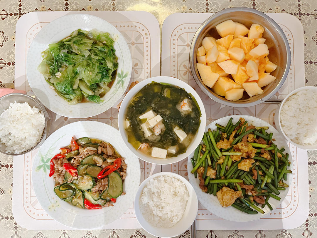 今日份:黄瓜辣椒炒肉,蒜苔肉丝炒鸡蛋,蚝油生菜和味增汤。
