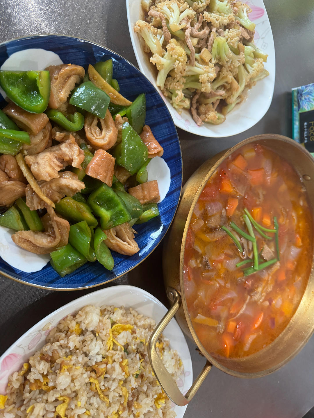土豆西红柿牛杂汤,大肠炒青椒🫑,花菜🥦肉丝,蛋炒饭