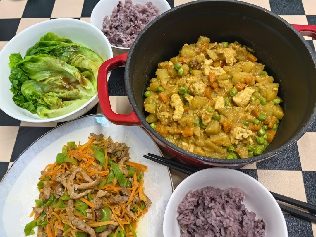 咖喱鸡 胡萝卜青椒肉丝 烫生菜