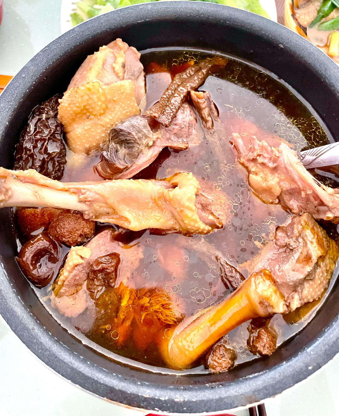三菇(猴头菇、松茸菇、羊肚菌)炖正番老鸭汤,炒生菜,苦瓜炒黑猪香肠,黄花鱼煮酱油)