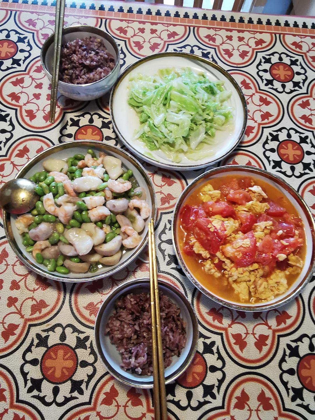 毛豆红菱炒虾仁,西红柿炒蛋,清炒包芯菜,杂粮饭