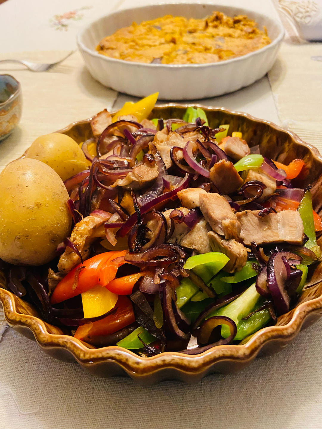 舒食365 做过 晚餐•2024年10月23日 洋蔥鹽煎五花肉和南瓜玉米粉菜糕。菜糕完全是為了清理冰箱的作品,結果意外好吃。半個圓白菜,機器切碎,一點剩火腿,1/3個烤南瓜,半個烤洋蔥,四匙玉米粉,充分混合,180度,烤30分鐘,蘸甜辣醋,太好吃了😋。就是賣相不足。#晚餐•2024年10月23日# 2024-10-24