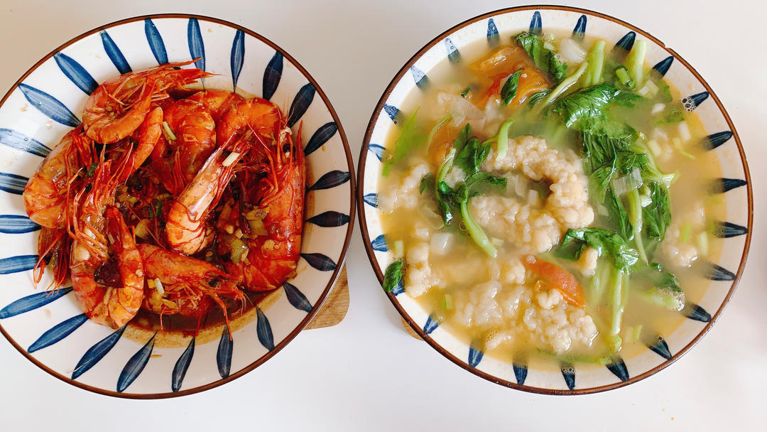 炒黑虎虾,青菜小酥肉汤