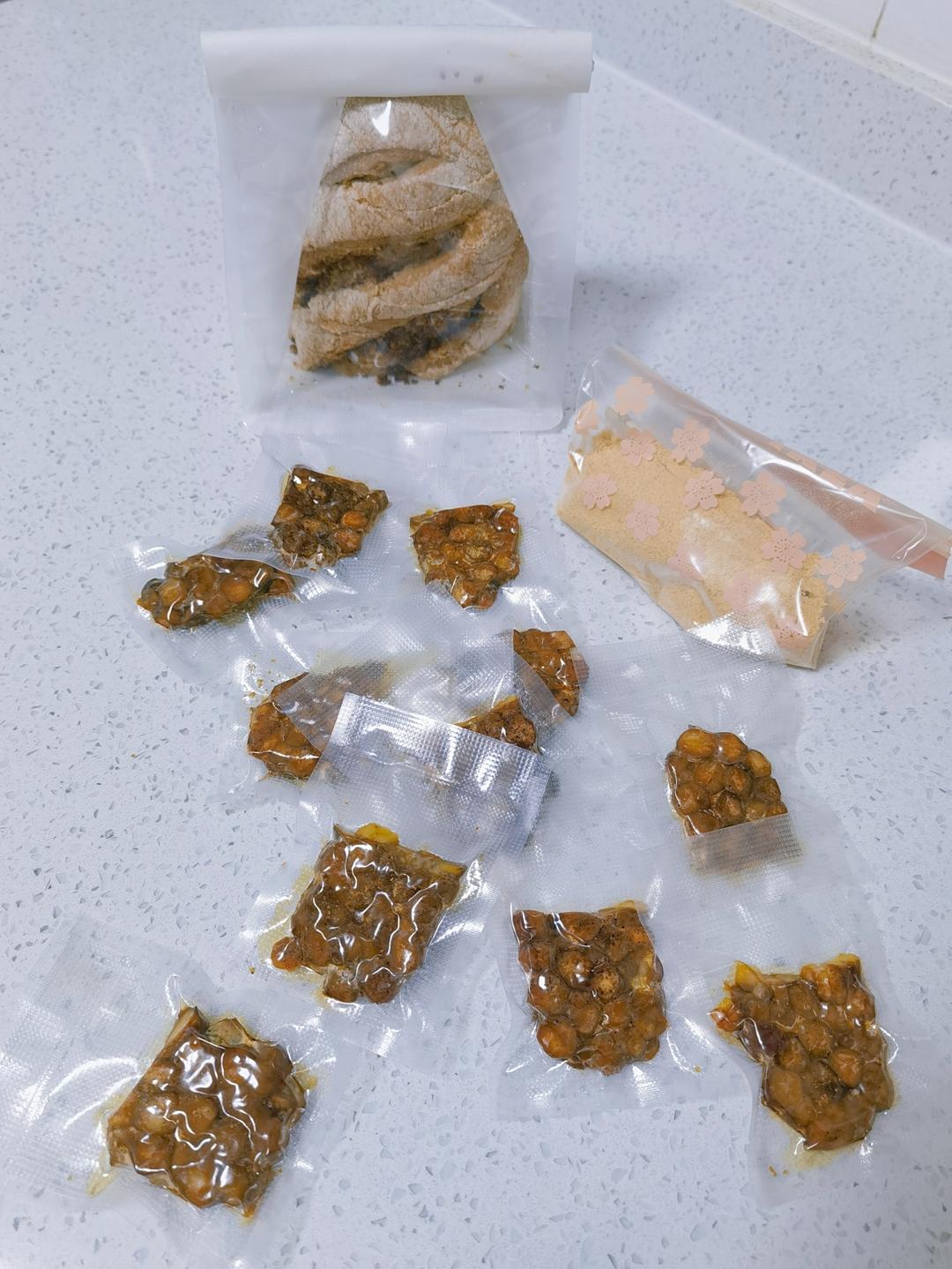 明天出门,赶路的干粮已备好:黑胡椒孜然鹰嘴豆天贝+纳豆冻干粉+自制无糖油全麦面包✌🥰