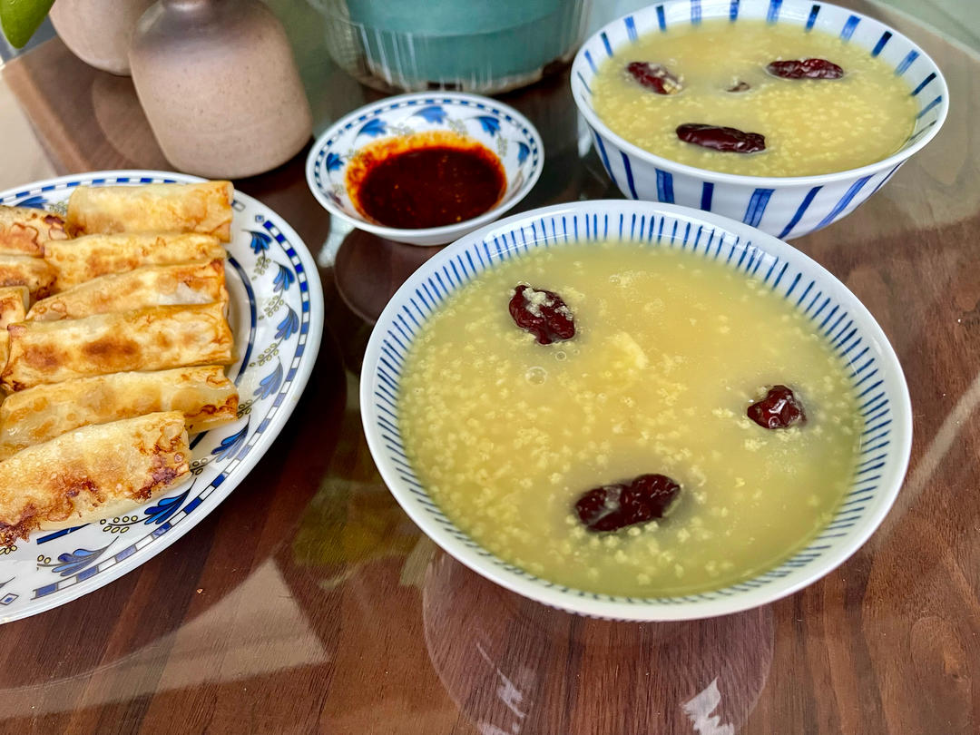 早起熬小米粥,锅贴