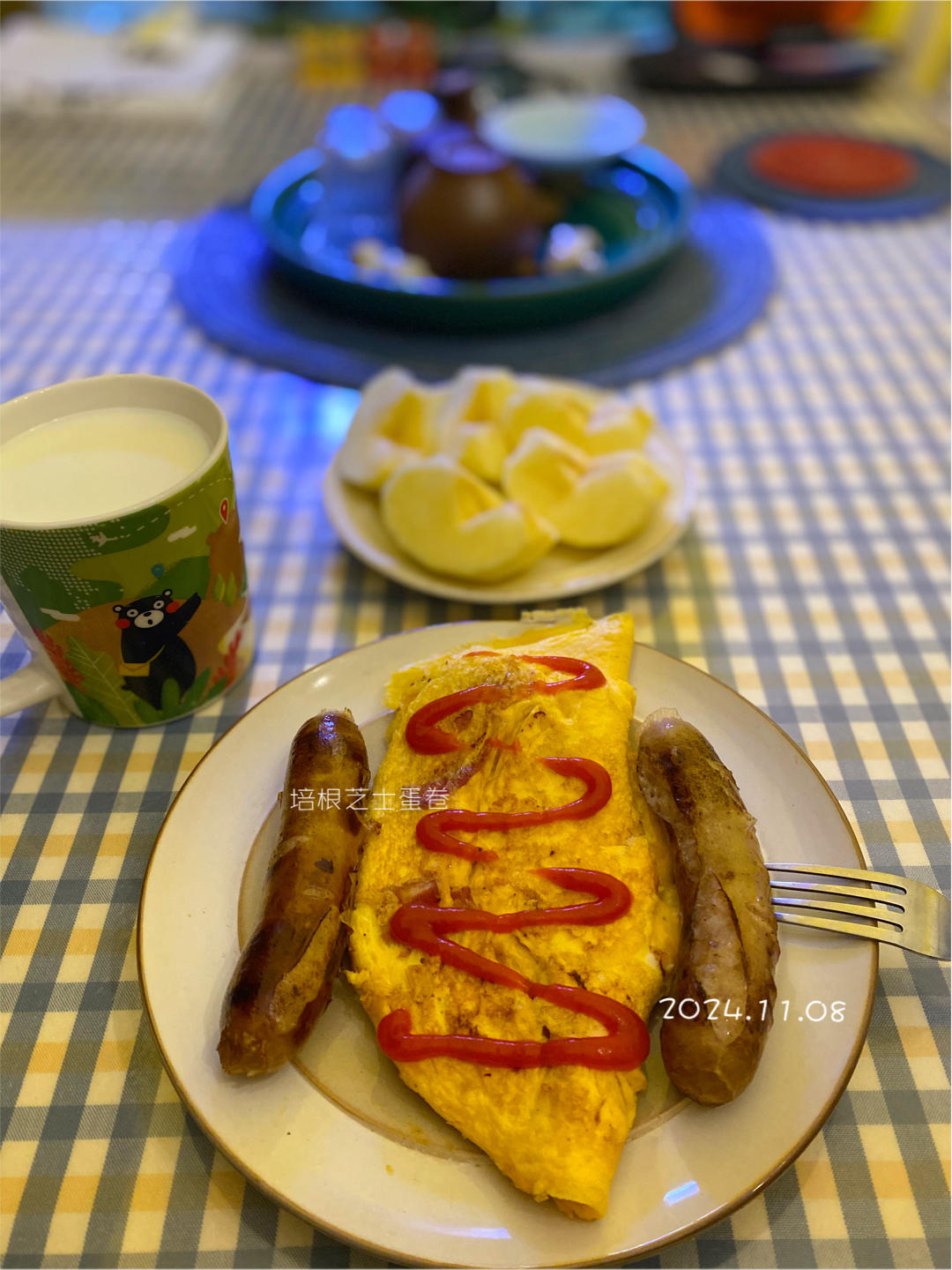 當夏 做过 sunny❤️you #sunny❤️you# #早餐•2024年11月8日# 培根芝士蛋卷:3颗蛋打散 2片芝士剪小块微煎 蛋液直接倒上去,小火,前面可以用铲子微微推一下,快凝固了就不要动了,维持完整的蛋饼状态,中间放一片芝士,折叠,挤番茄酱,OK 2024-11-08