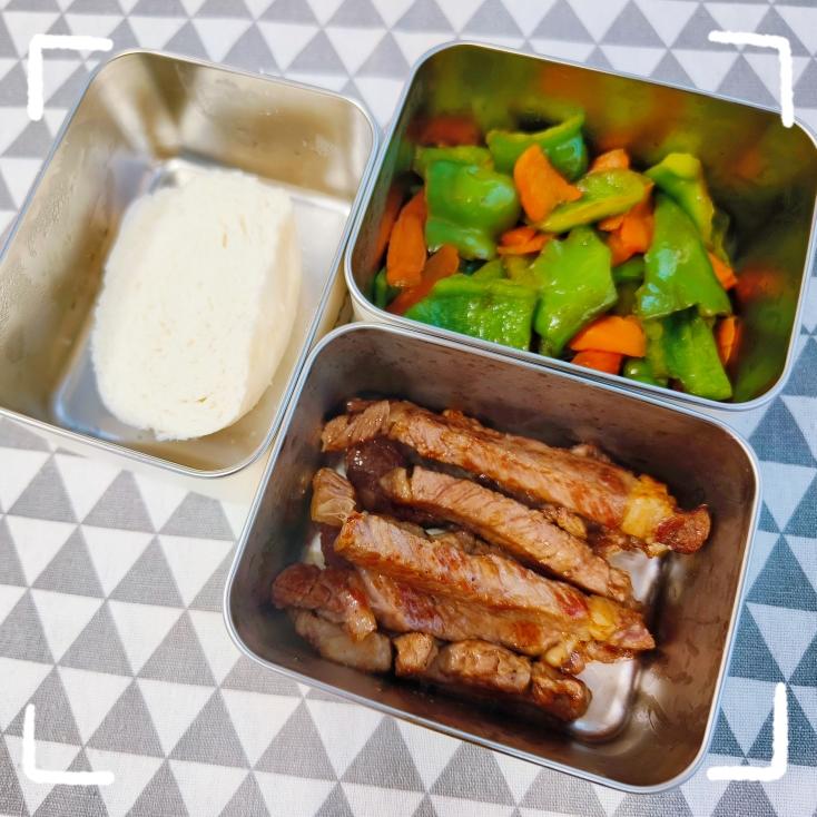 花生妈de小厨房 做过 早餐•2024年11月14日 #早餐•2024年11月14日# #加入带午餐大军# 呀 今天的忘了发炒青椒 牛排娃是金针菇炒鸡蛋 牛排这个青椒是一整个装到盒里这么多 2024-11-14