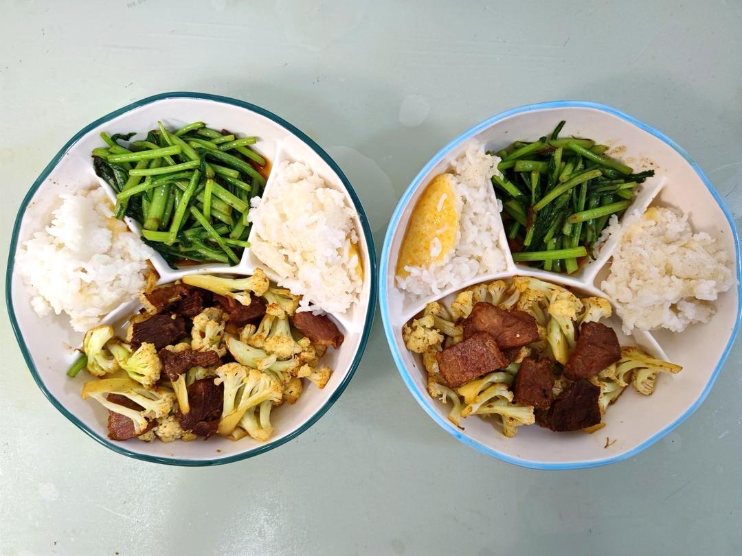 牛肉炒菜花,素炒蒿子秆,米饭+玉米饼