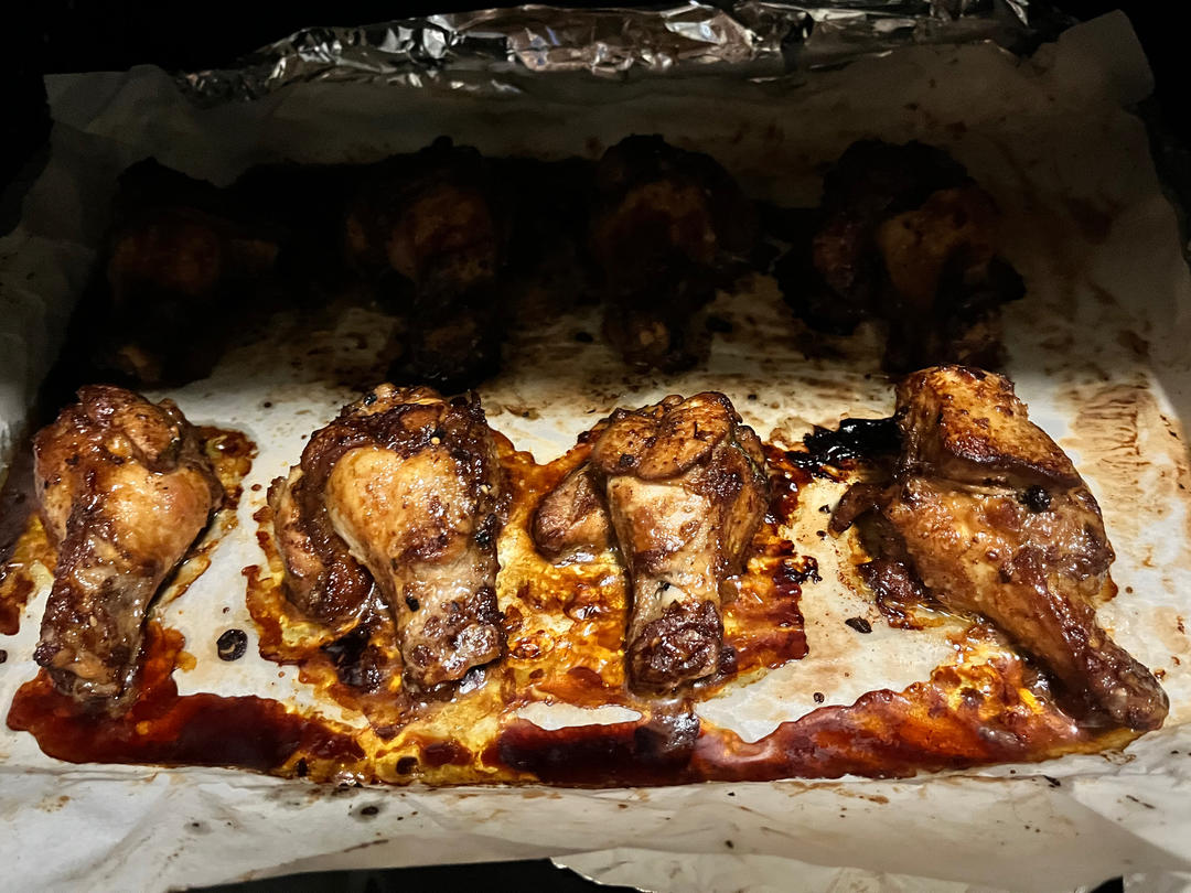 A尘嫣 做过 蒜香烤鸡翅根 #晚餐•2024年11月28日# 8个翅根,3勺生抽一勺老抽一勺料酒半勺糖3勺烧烤调料1勺辣椒面2勺蒜泥酱1把葱腌制24小时,烤箱200度30分钟,嘎嘎香吃迷糊了~~~ 2024-11-28