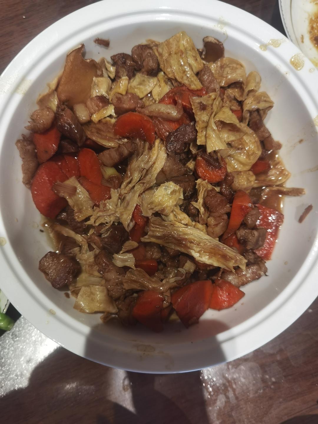 lncyryy 做过 2024年12月01日 红烧肉炖胡萝卜腐竹猪肉炒出油脂,放大葱姜片,生抽老抽耗油,花椒粒,多表会。放胡萝卜块再炒。放热水炖,放盐。肉熟了,放泡好的腐竹,炖烂收汤。 2024-12-01