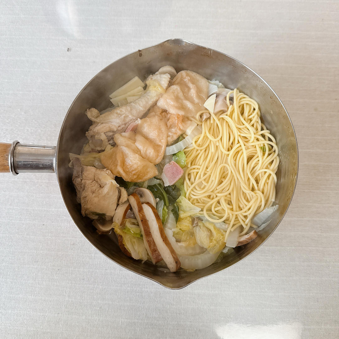 面条,白菜,青菜,冬笋,豆干,油面筋,口蘑,火腿,鸡肉,鸡汤。