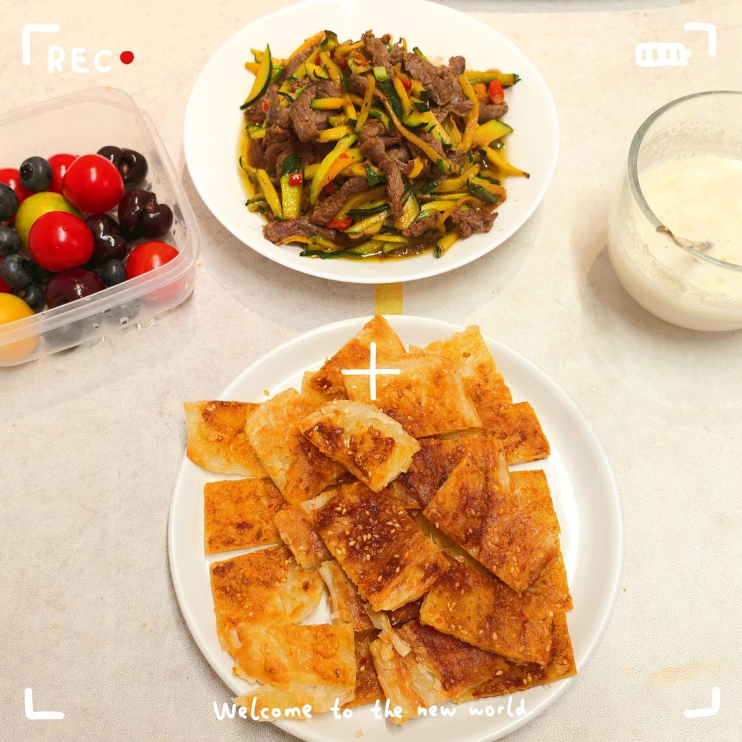 今日早餐:酱香饼➕嫩南瓜炒牛肉➕牛奶米糊➕混合水果