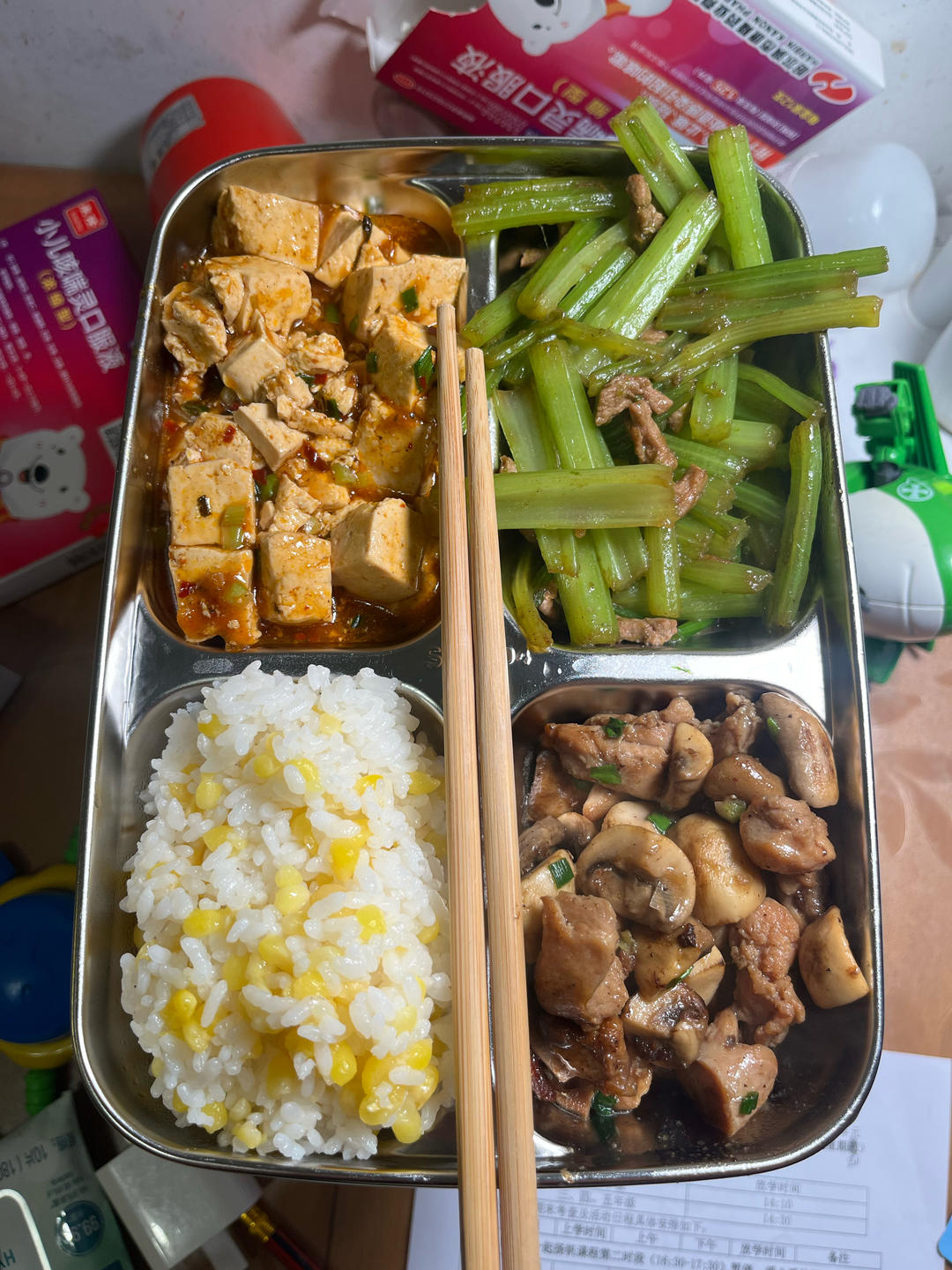 鸡腿肉炒口蘑,芹菜炒肉丝,酱焖豆腐