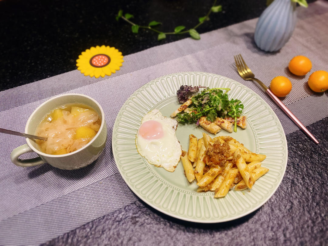 银耳汤、意面、煎蛋、羽衣甘蓝沙拉
