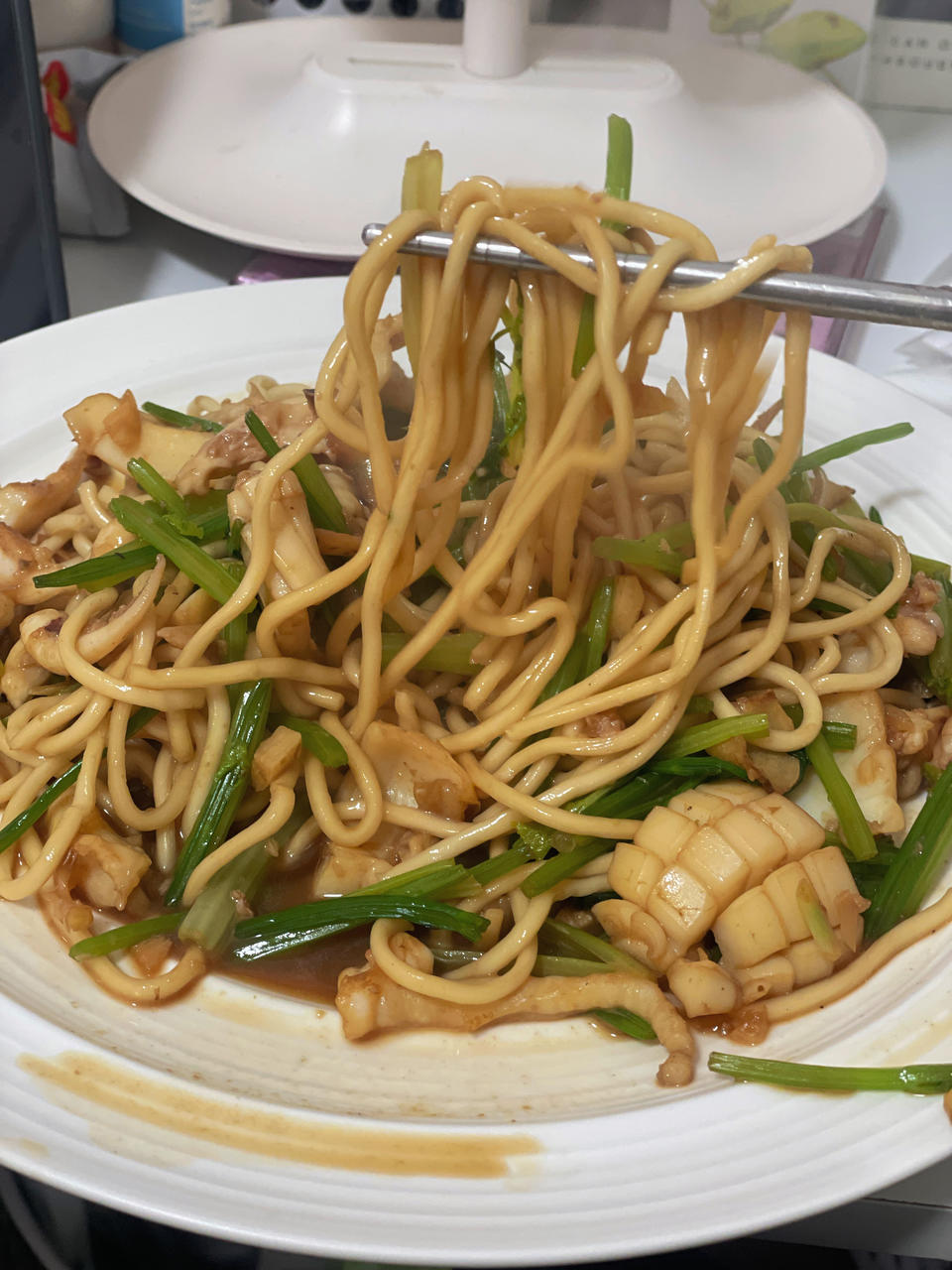 Jo_Ly 做过 2025年01月08日 墨鱼面1⃣️墨鱼开水焯一下就捞出不要太熟了(去咸味),面煮到7-8分熟捞出。都过一遍冷水2⃣️热油下姜蒜炒香把墨鱼一起放下去炒几下就马上放蔬菜。蔬菜难熟就先炒蔬菜再放墨鱼3⃣️淋入料酒、生抽、一点白糖,再加半碗-一碗水4⃣️水开把面倒进去搅拌搅拌。差不多就可以出锅了 01-08