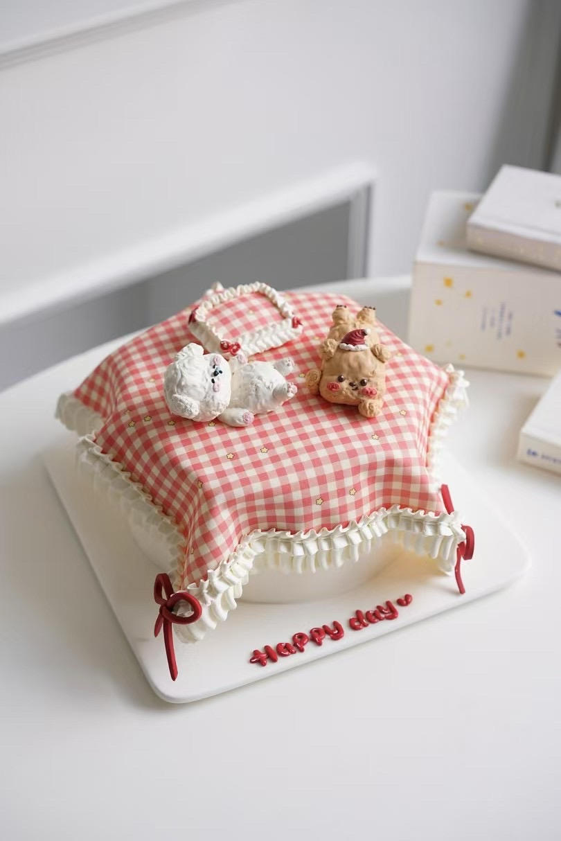 Cici的甜蜜时光 做过 2025年01月11日 8单蛋糕盒,6寸蛋糕3格3片,8厘米高,压矮一点,翻糖喷水,抹匀,粘糯米纸一盆热水包上保鲜膜,放桌布拉线膏捏形状,再挤动物红色小蝴蝶结,奶油霜大蝴蝶结。翻糖奶油霜,惠尔通125,左右拉韩式67 左右拉红色奶油霜写字 2025-01-11