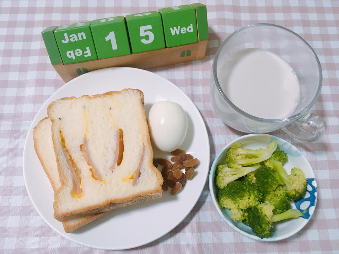 ㋀㏮放假第3️⃣天 芝士🧀火腿吐司🍞加煮蛋🥚搭西蓝花🥦配核桃乳佐葡萄🍇干