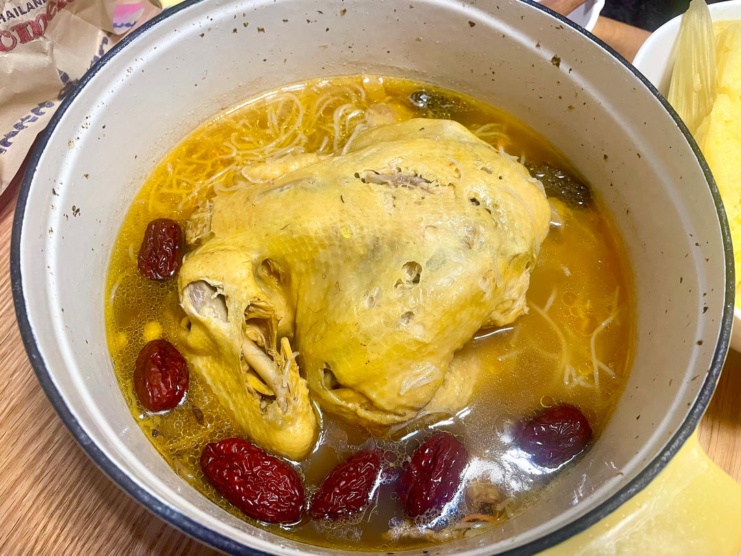 土黄鸡小小一只900克两个人吃刚刚好,加了一点米粉,特别好吃,汤非常鲜!好吃!
