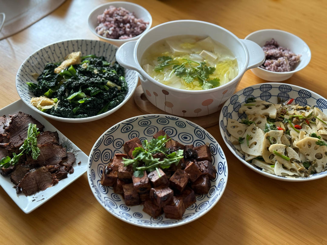 酱烧豆腐 酱牛肉 酸菜藕片 腐皮菊花菜 白菜豆腐汤